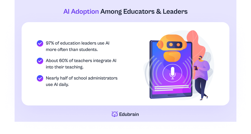Interestingly, 97% of education leaders now use AI even more than students do. About 60% of teachers integrate AI into their lessons, and nearly half of administrators use it daily.