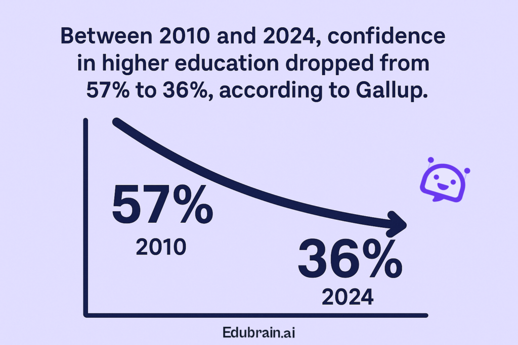 Confidence in college has been falling across the United States. Gallup and the Pew Research Center surveys show that fewer college students believe a degree is the best path to success. One Pew study found that only 22% of adults think a four-year degree is worth the price if loans are needed. Almost half said it only makes sense without borrowing, and about a third said it is not worth it. These numbers reveal how much the rising cost of tuition and debt has shaped public opinion in recent years. The divide also shows up in politics and personal experience: