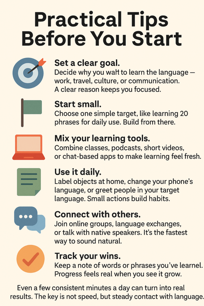 It’s easier to make progress when you begin with a clear plan. You don’t need to study for hours or follow strict rules. What matters is finding a routine that fits your day and staying with it. Here are a few simple steps that help you choose the best language to learn :