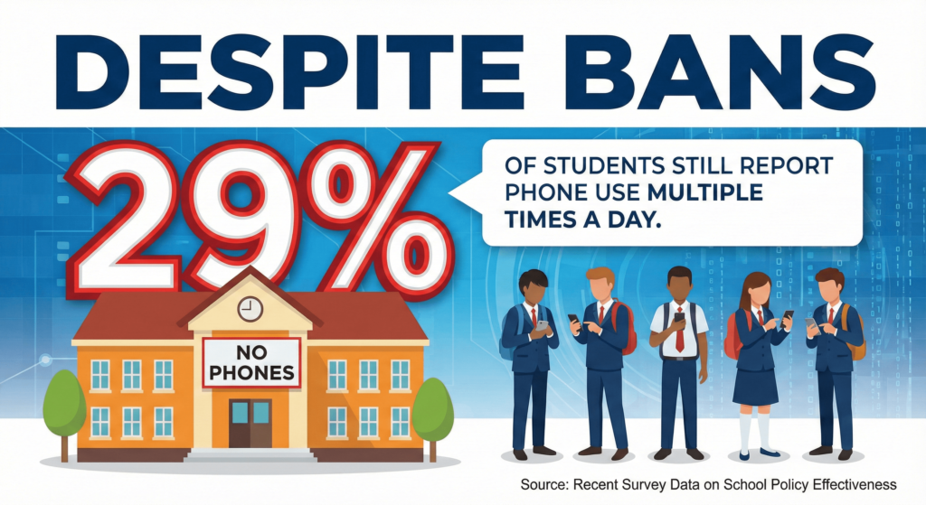 - In schools with bans, 29% still report cellphone use several times a day, and 21% say they use a phone every or almost every day at school.
