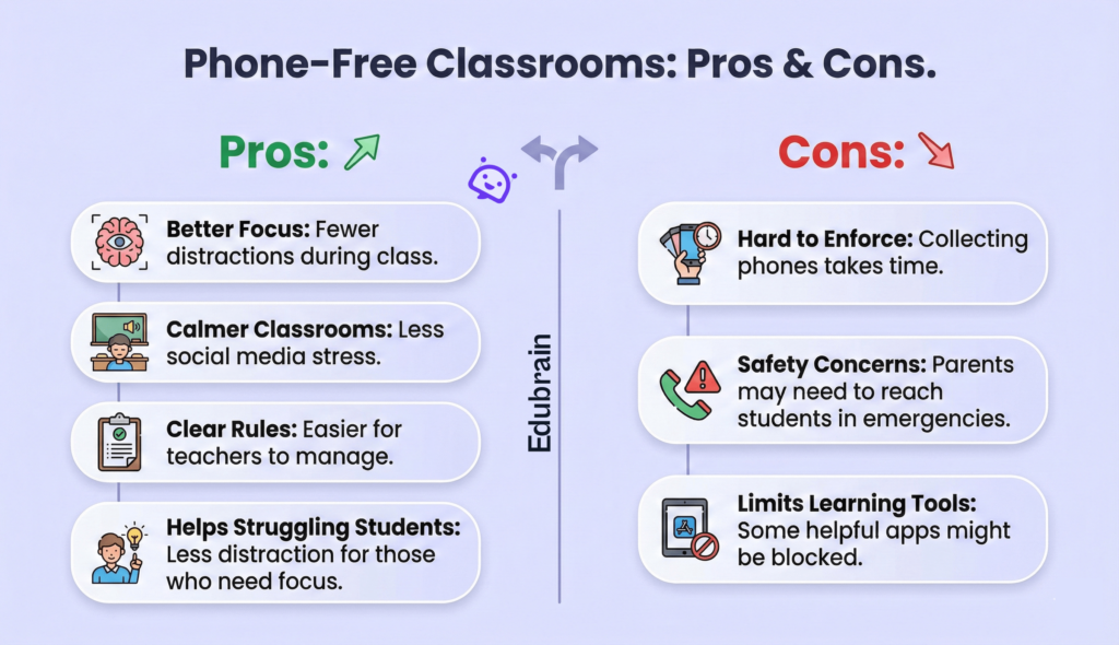 School phone rules often differ from daily practice, and teachers must balance lessons with discipline. Because time is short, most rely on reminders instead of strict checks. As a result, students still use phones during breaks, in cafeterias, and on buses. Some schools use lockable pouches, others depend on silent mode, and older students often have more freedom than younger ones. However, phones can also support study when used with purpose. Many students now use EduBrain homework helper, calculators, note organizers, and time trackers to plan tasks, solve exercises, and manage their focus. With clear rules and guided use, phones can shift from a distraction to a practical study support.